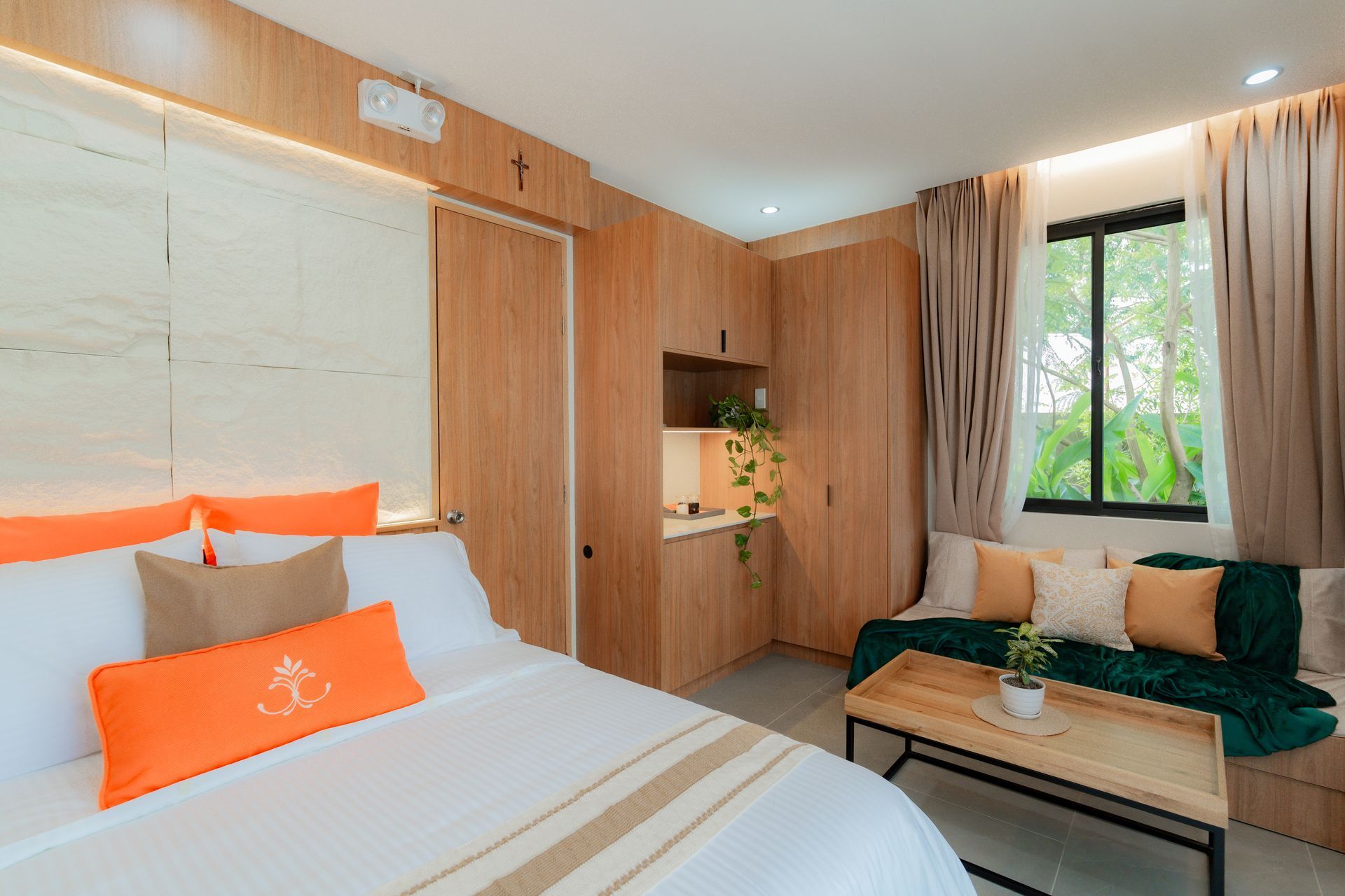 Our Couple Villa is designed as a quiet retreat for two, thoughtfully appointed with a queen-sized bed, a reading nook by the window, and its own private bathroom. Each villa faces the pool, offering a serene view that enhances its calm and intimate atmosphere. Perfect for couples seeking rest, the villa also provides the option to extend the stay to four guests with extra bedding — a space that balances privacy, comfort, and countryside charm.